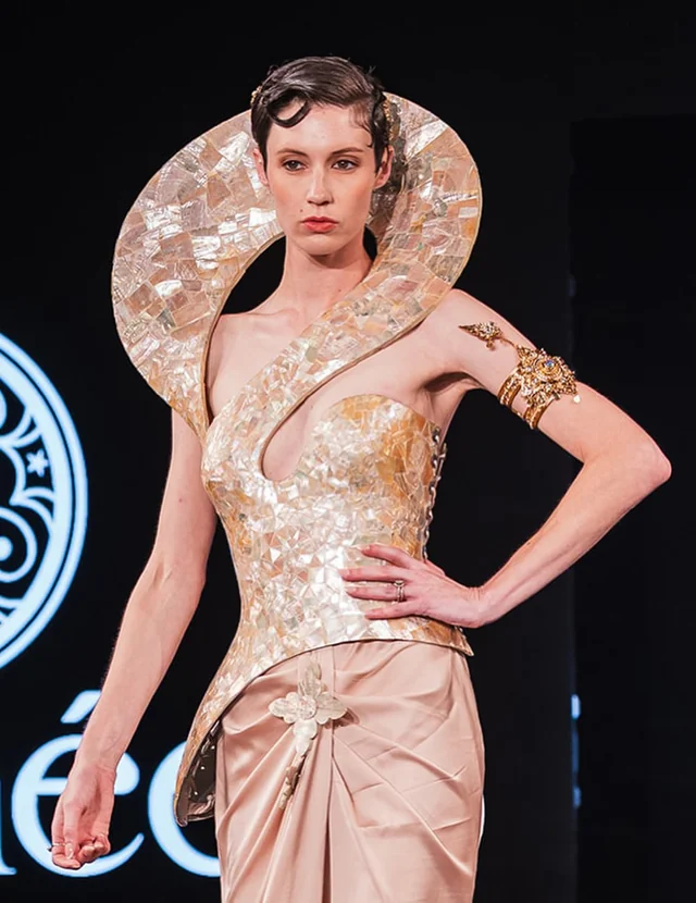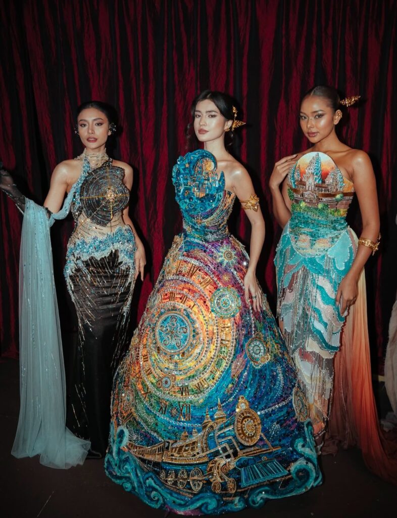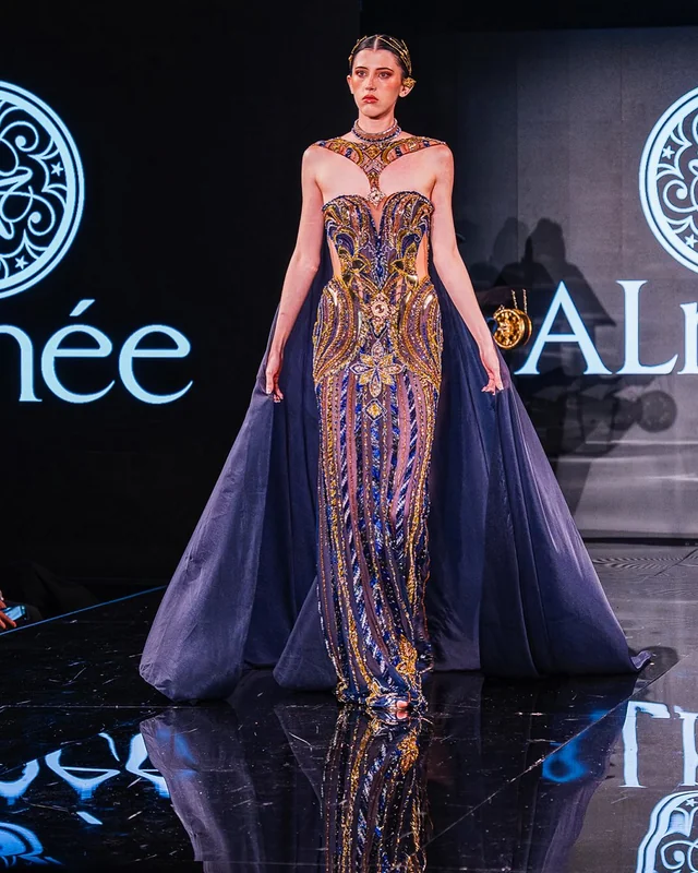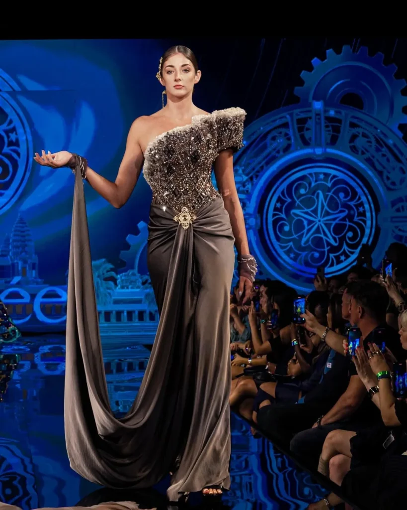 This season’s collection, titled “Spirit of the Forgotten,” unfolded as both a visual and emotional requiem. It paid tribute to Sokhong Taing, the late founder of Almee Couture, whose vision and artistry continue to shape the house even in his absence. Designed by Hang, Taing’s creative partner, the collection transformed mourning into magnificence, weaving a narrative where loss, time, and cosmic reverence converged in radiant harmony.