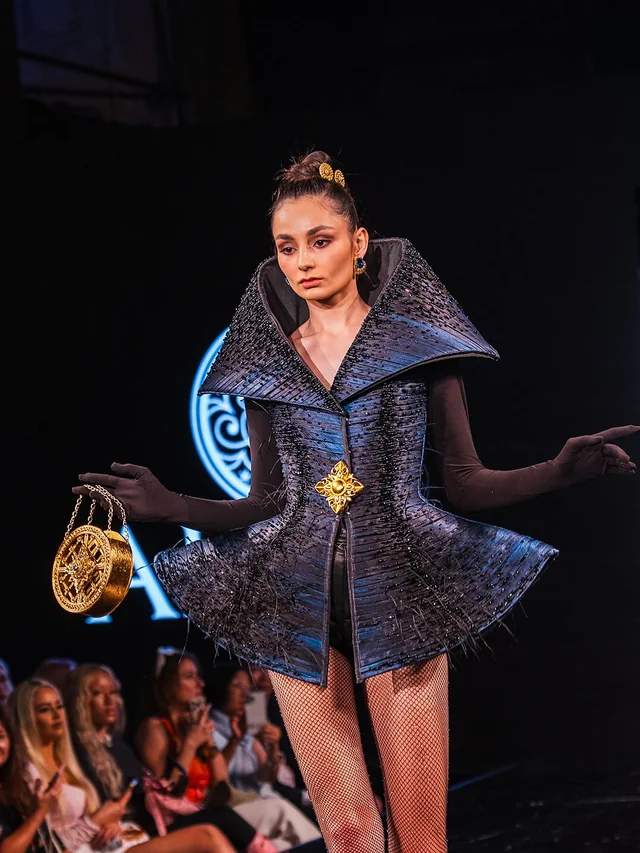At the center of the presentation stood its pièce de résistance — the 23-kilogram gown “Time.” As it appeared beneath the runway lights, the air shifted; every shimmering movement seemed to suspend the audience in collective breath. More than a garment, Time was a celestial monument — a meditation on existence itself.