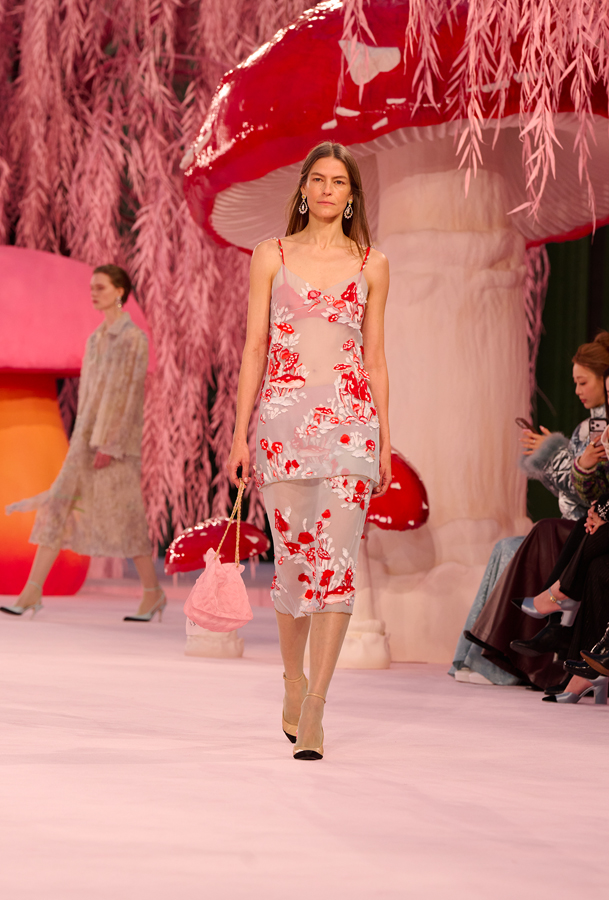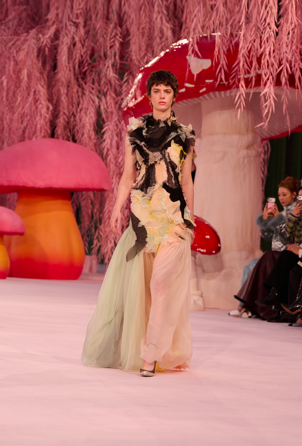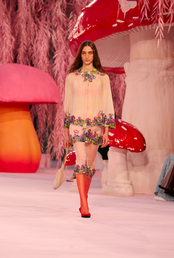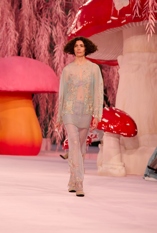 Presented beneath the glass dome of the Grand Palais, the show unfolded in a surreal garden of towering red mushrooms and weeping willows. The set, softly lit in blush tones, framed what Blazy described as an exploration of “impossible lightness.”