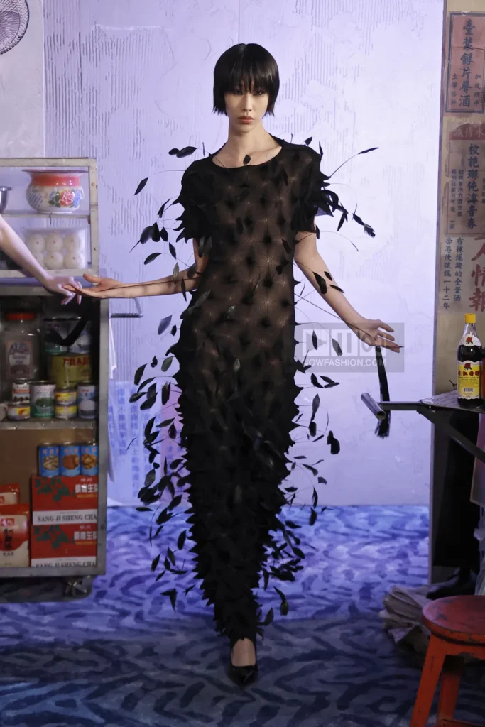 For Lo, whose work is inherently tactile—defined by sculptural spikes, second-skin silhouettes, and experimental surfaces—the format felt organic. Black and emerald spiked knits, feather-fluted fabrics, silk trousers with felt insets: each piece revealed its narrative through touch. The juxtaposition between coarse and smooth materials, rigid and fluid elements, became not just aesthetic, but experiential.