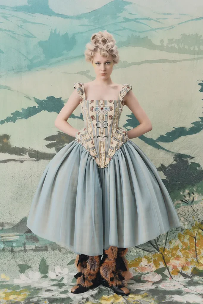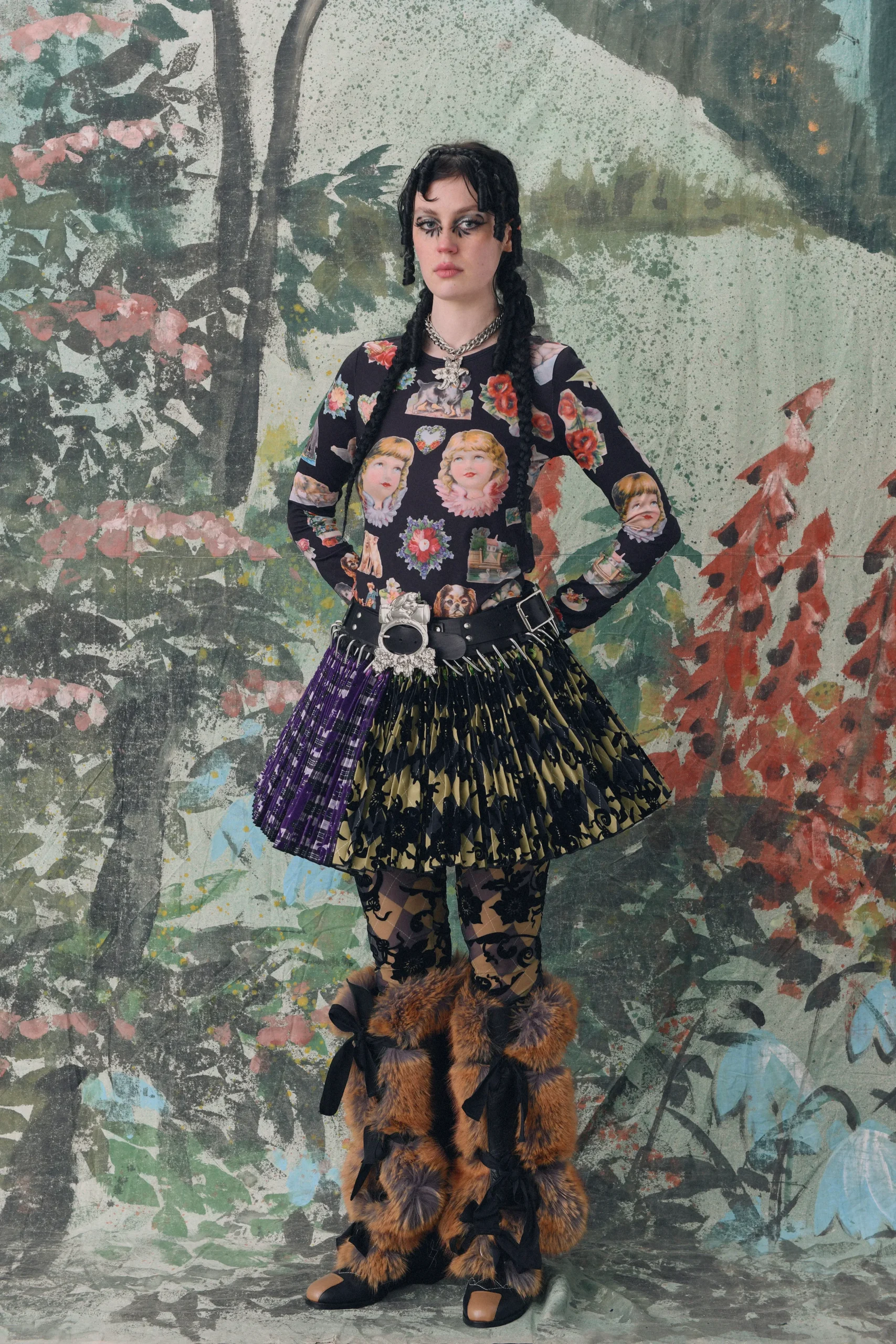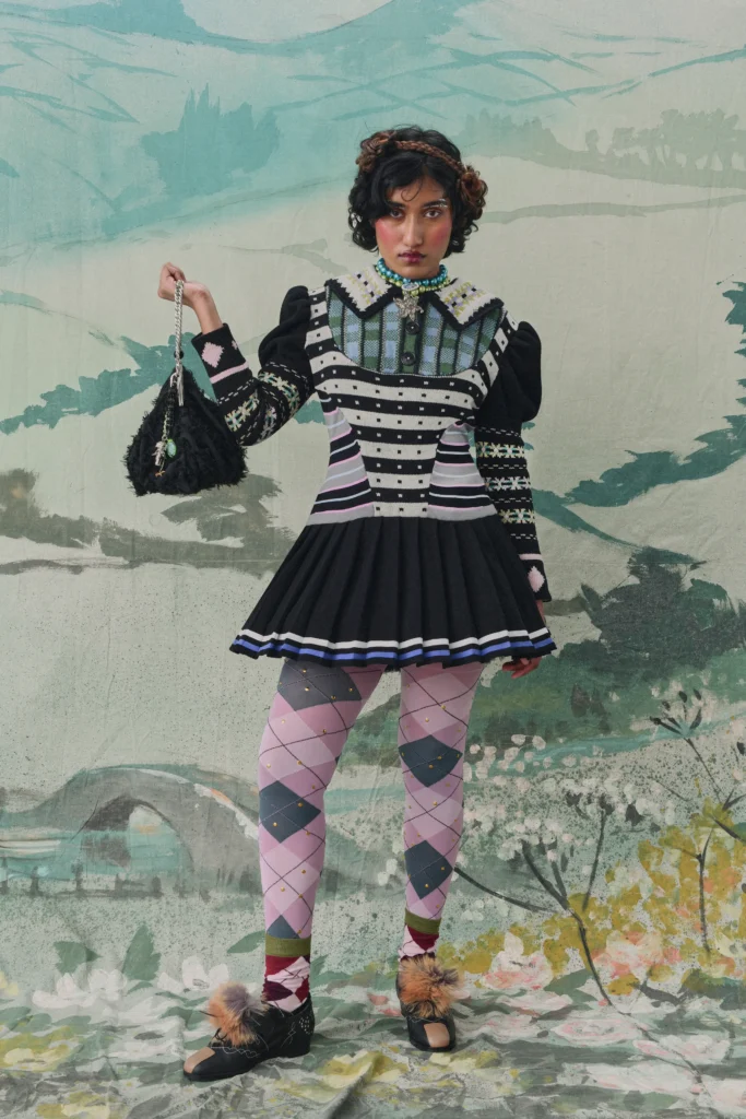There’s a particular British eccentricity anchoring this collection: tartans, chokers, pony-bead skirts, fur-trimmed boots, and pastoral backdrops reminiscent of faded manor house murals. Even the Regency mourning dress references feel tongue-in-cheek rather than reverential.