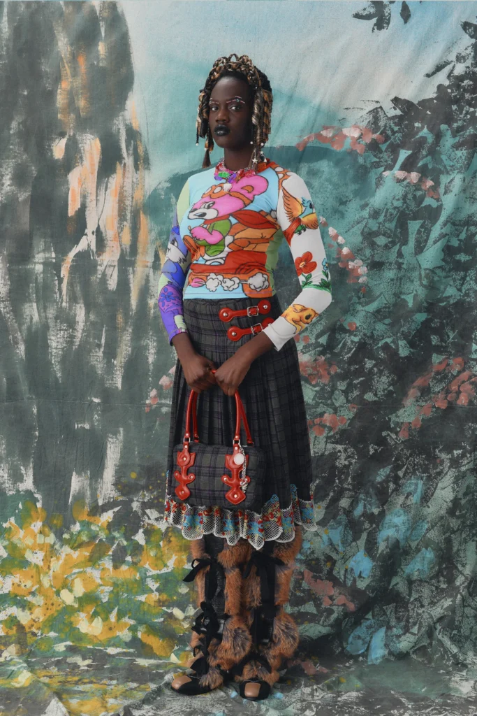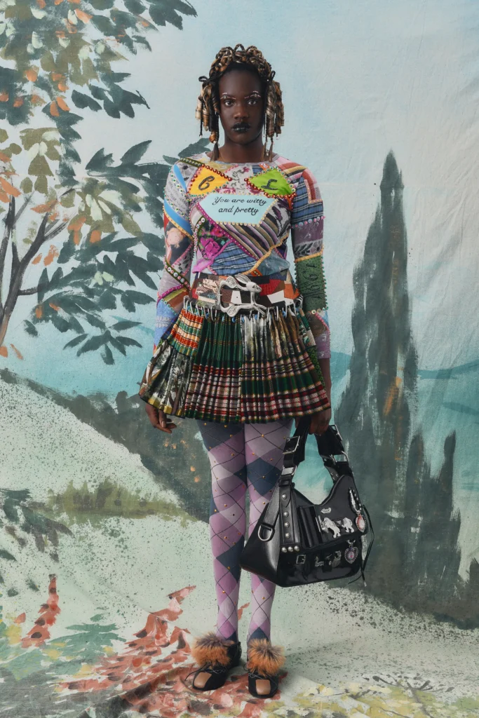 This season, however, arrived with a twist: no runway. Presented as a lookbook rather than a live show during London Fashion Week, the collection traded communal chaos for controlled imagery. While the clothes remain exuberant, the absence of their signature charged atmosphere was palpable.