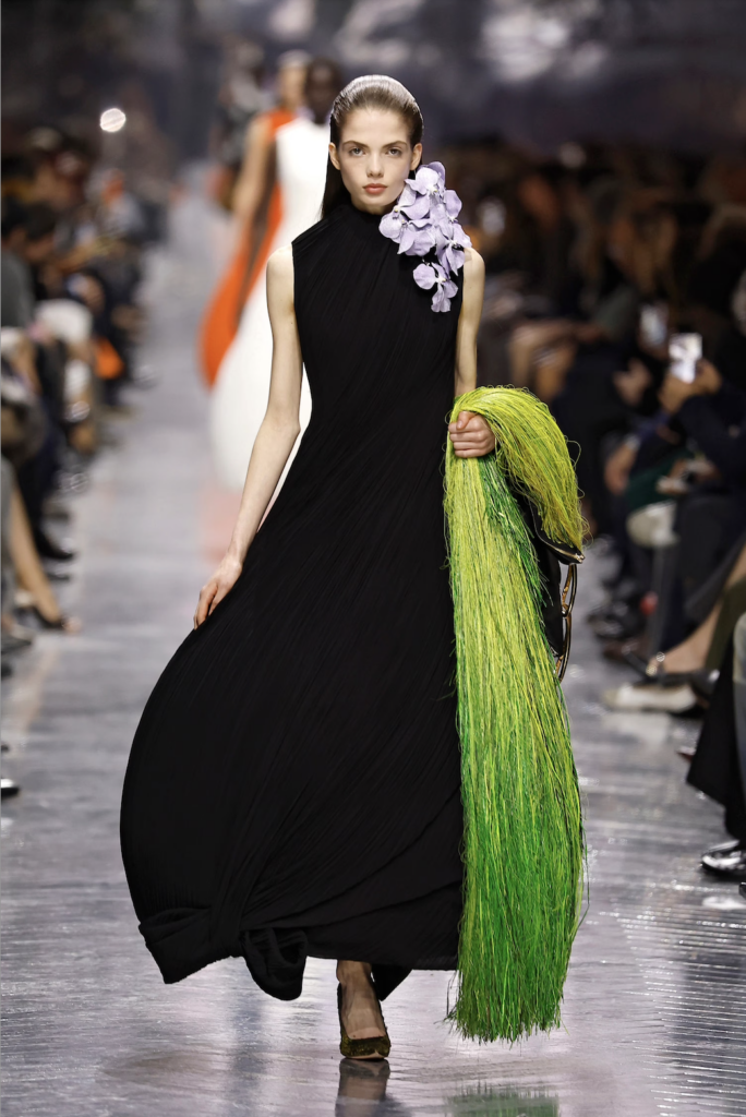 Floral motifs permeated the show: silk blossoms cascaded from collars, leather foliage crowned heads, and one model carried a silk-and-brass leaf parasol. Lady Dior bags appeared alongside surreal minaudières shaped like ladybugs. Grassy textures, mollusk-like spirals, and bulbous skirts reinforced the organic theme.