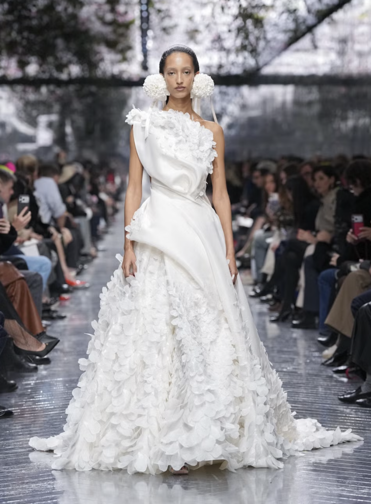 Titled not by slogan but by spirit, Dior Haute Couture Spring–Summer 2026 positioned craft as “living knowledge.” Prior to the runway, the Maison screened a short film featuring floral vignettes and anthropomorphic ceramics by British-Ghanaian artist Magdalene Odundo. Close-ups of thimbles, pins, scissors, and measuring tapes foregrounded the technical labor underpinning couture at its highest level.