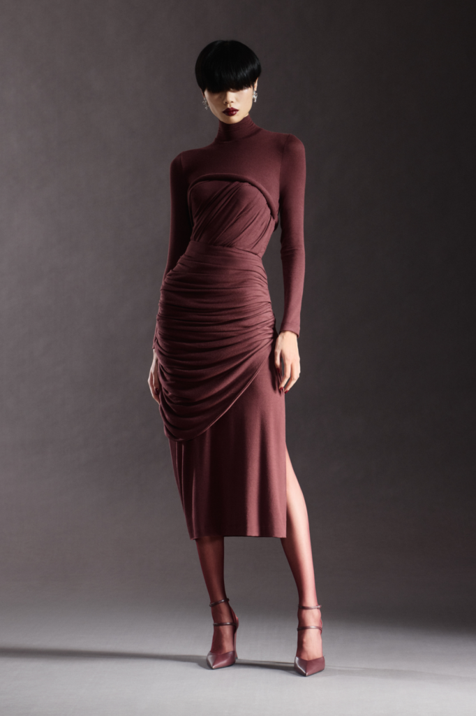 A standout example is a body-hugging cashmere jersey dress, pleated with precision yet constructed to accommodate ease — a quiet reminder that sensuality and function are not mutually exclusive.