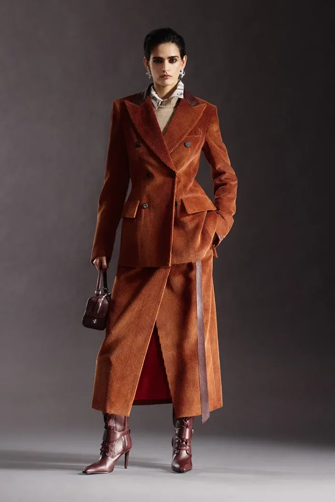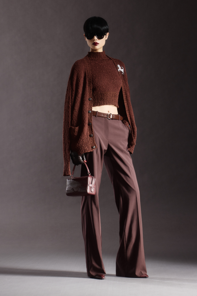Ferrari’s Pre-Fall 2026 unfolds in three deliberate phases, mirroring the logic of seasonal dressing. Early looks favor lightness: linens, silks, and fluid forms in softened tones. As the collection progresses, materials gain weight and density — technical cottons, denim, leather — before settling into flannel, corduroy, wool, and shearling.