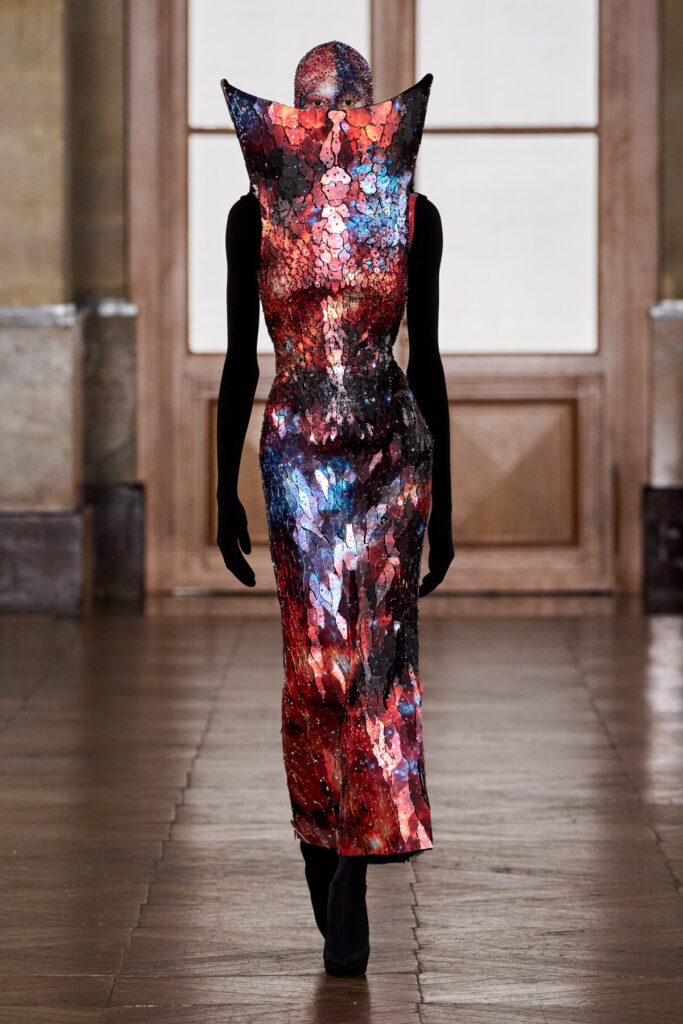 - Cosmic Becoming: A closing gown composed of over 2,000 individually placed resin elements shimmered in changeant tones reminiscent of deep-space photography. With face and hair painted to match, the model appeared less like a muse and more like the universe embodied.