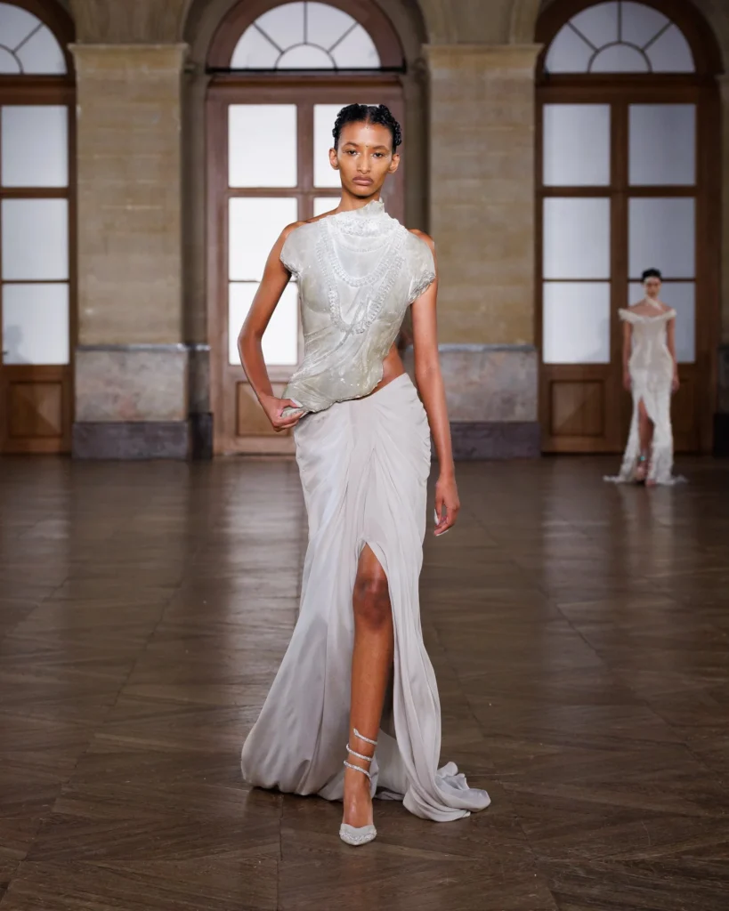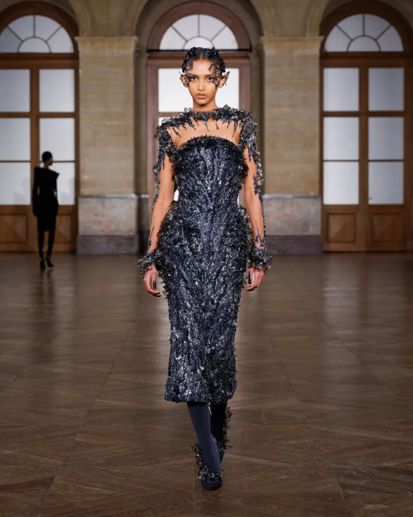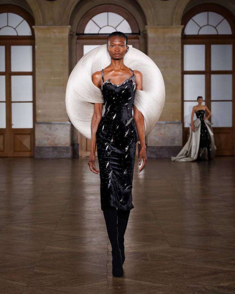 In one of the show’s most arresting moments, twin silhouettes walked hand-in-hand in two enmeshed dresses connected by continuous cords. The effect was visceral: separation dissolving into unity. A black gown, embroidered with stardust-like trails, evoked the cosmos before creation—the Big Bang rendered in couture.