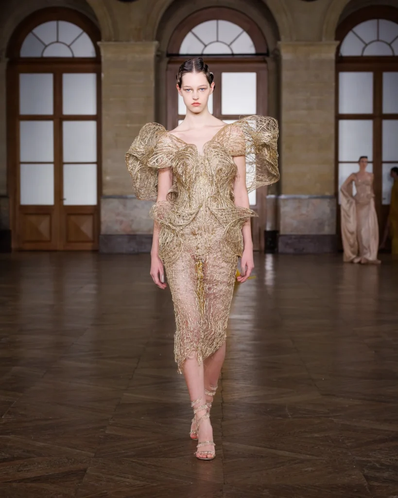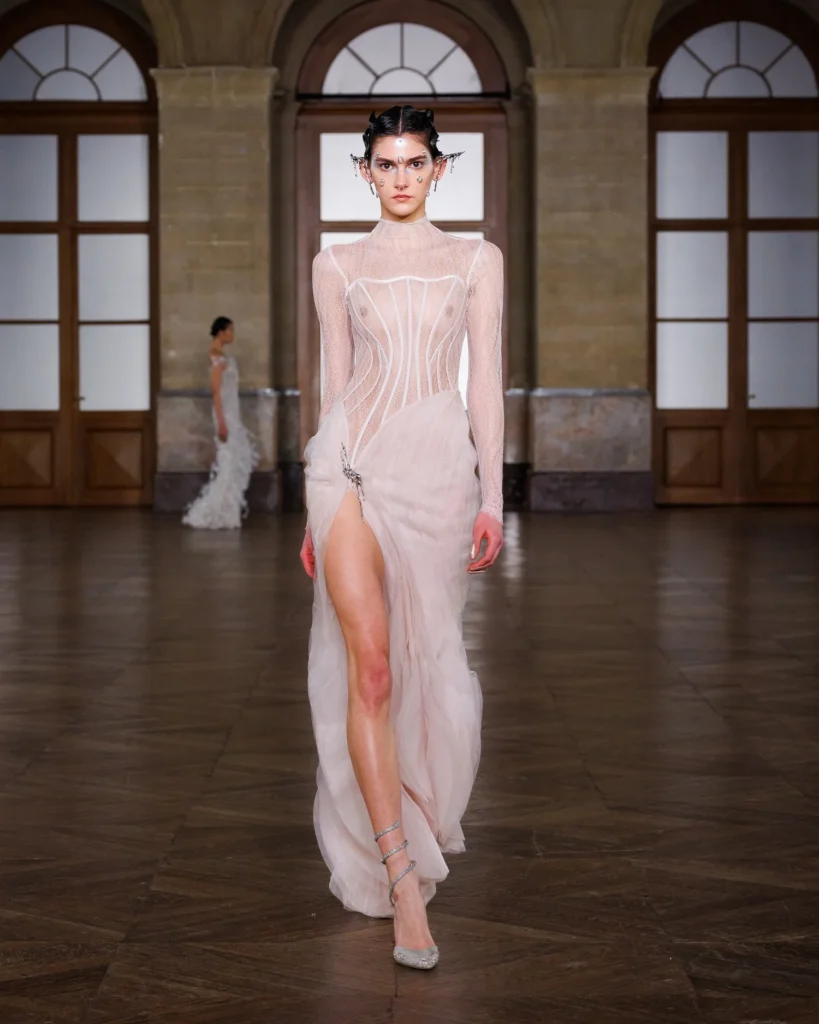 True to Gupta’s signature, silhouettes balanced architectural drama with fluid drapery. Sculptural lattices met flowing sari-inspired forms. Rigid corsetry dissolved into corded ruffles. Resin structures hovered against sheer textiles. The garments were not simply decorating the body—they were mapping consciousness onto it.