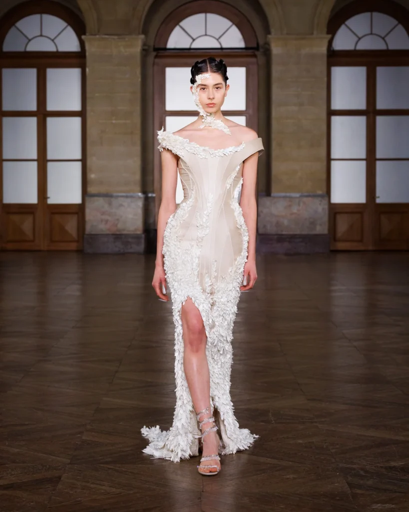- The Emergence of Life: A long white column dress bloomed like a flurry of flowers, while another silhouette featured reptilian textures, evoking early terrestrial forms.