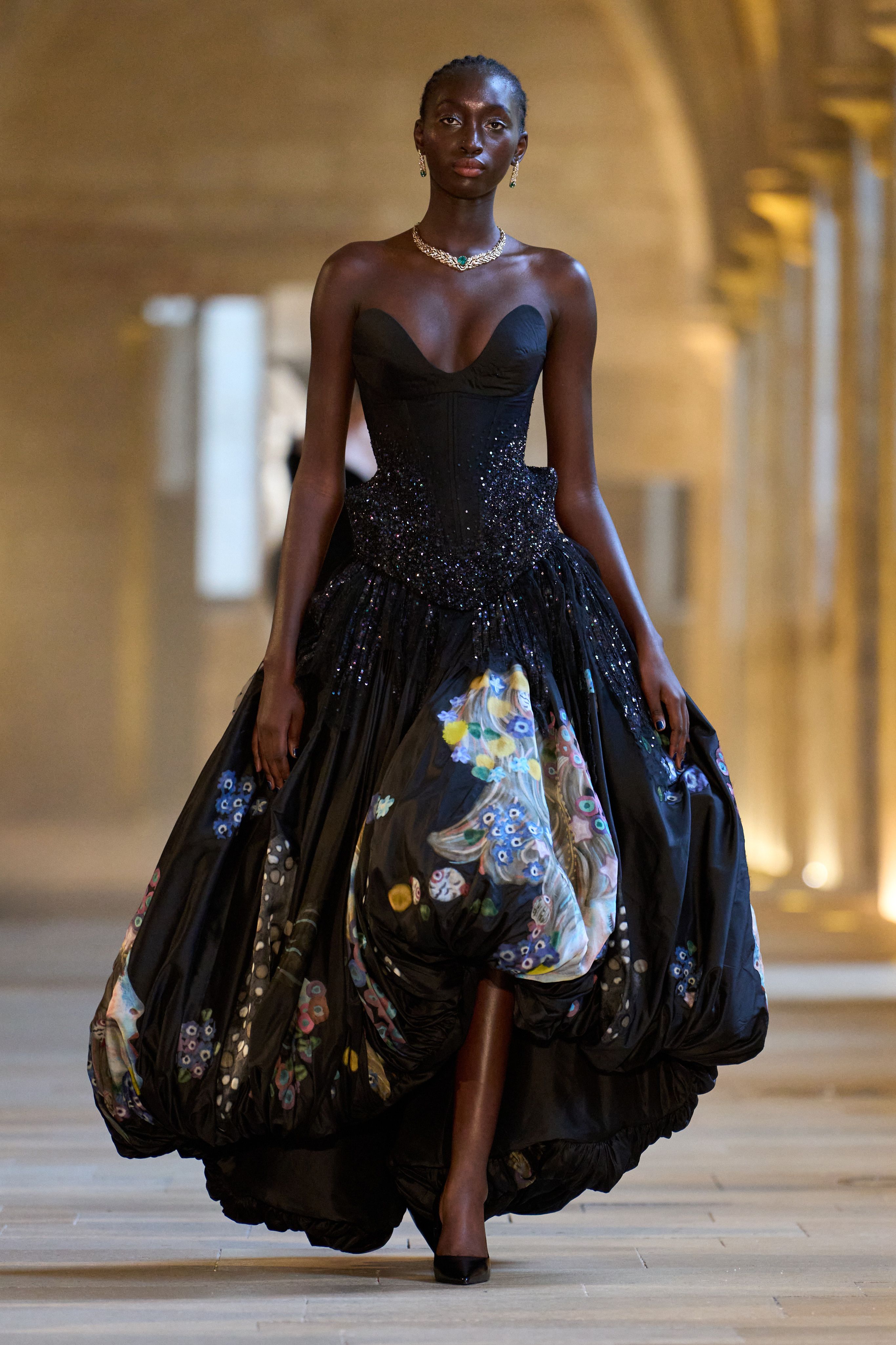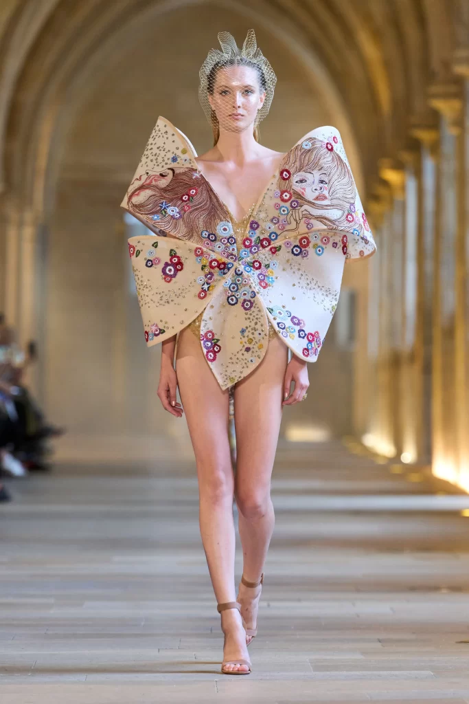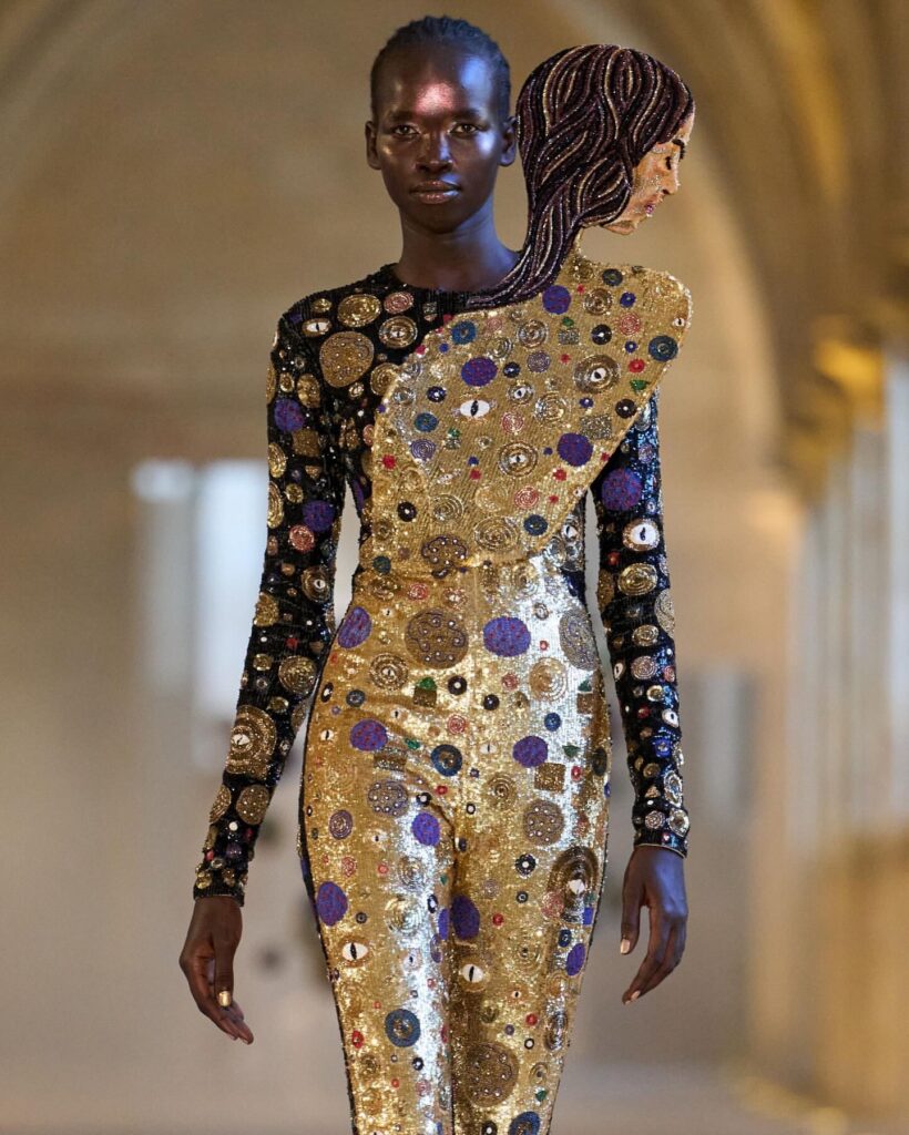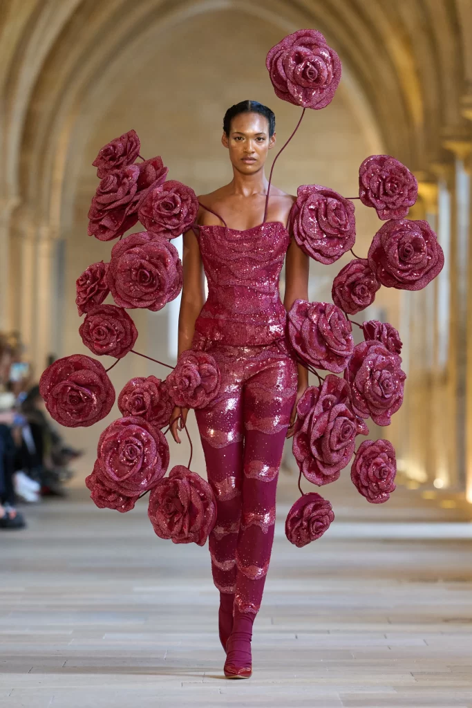 Opening with a gold sculptural gown shaped like a swirling anatomical heart, the collection announced its intention boldly—this was not a typical romantic narrative. With vein-like embroidery and a sequined corset at its core, the look embodied the early stages of desire and infatuation. The final look—a black heart-shaped dress—closed the show in what felt like an elegiac echo, hinting at love’s final transformation, or perhaps its rebirth.