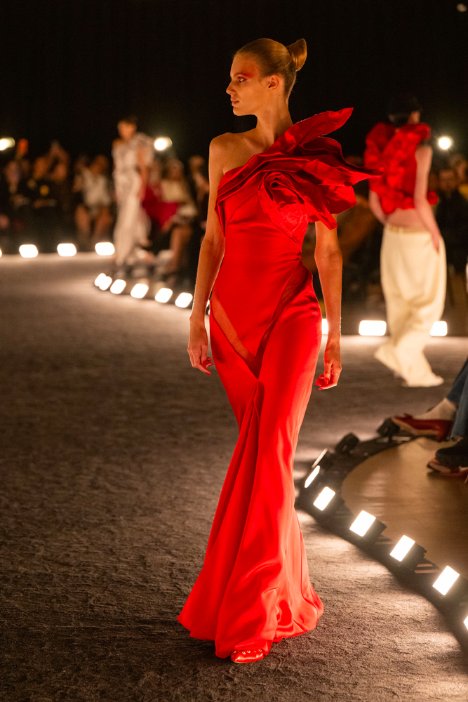 The show began under dim lighting, a nod to the title, with a haunting score that felt suspended between surrealism and silence. For a designer known for gold-tipped drama and meme-making couture moments, this collection marked a turn inward — a quiet, moving rediscovery of balance between artistry and wearability.