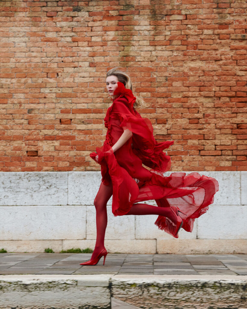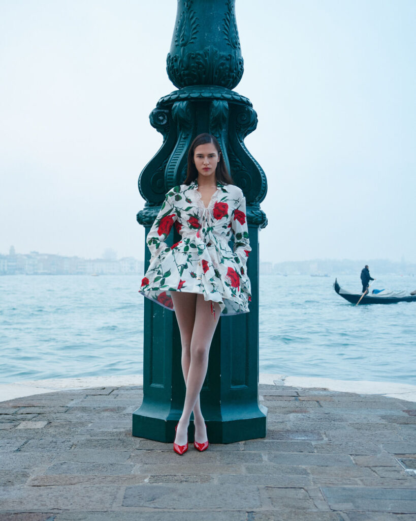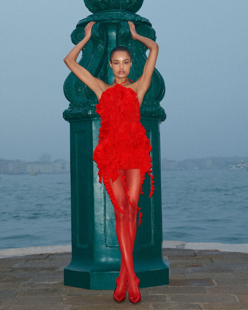 For Pre-Fall 2026, David Koma turned to Venice—not the sunlit city of postcards, but the hushed, seductive Venice that emerges after dark. Unveiled through a cinematic lookbook, Venetian Nights channels the city’s nocturnal stillness and veiled sensuality, weaving them into Blumarine’s evolving language of dark romanticism. The result is a collection that feels both atmospheric and assured, grounded in the house’s legacy while sharpened by Koma’s sculptural precision.