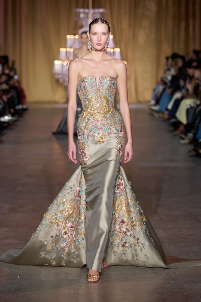 Embellishment—a Murad signature—draws heavily from Renaissance frescoes, cathedral ceilings, and gilded ornamentation. Silk-thread embroidery is enriched with metallic strands, pearl detailing, delicate cabochons, and protective chain motifs reminiscent of relics. These elements elevate the garments into talismans: couture as protection.